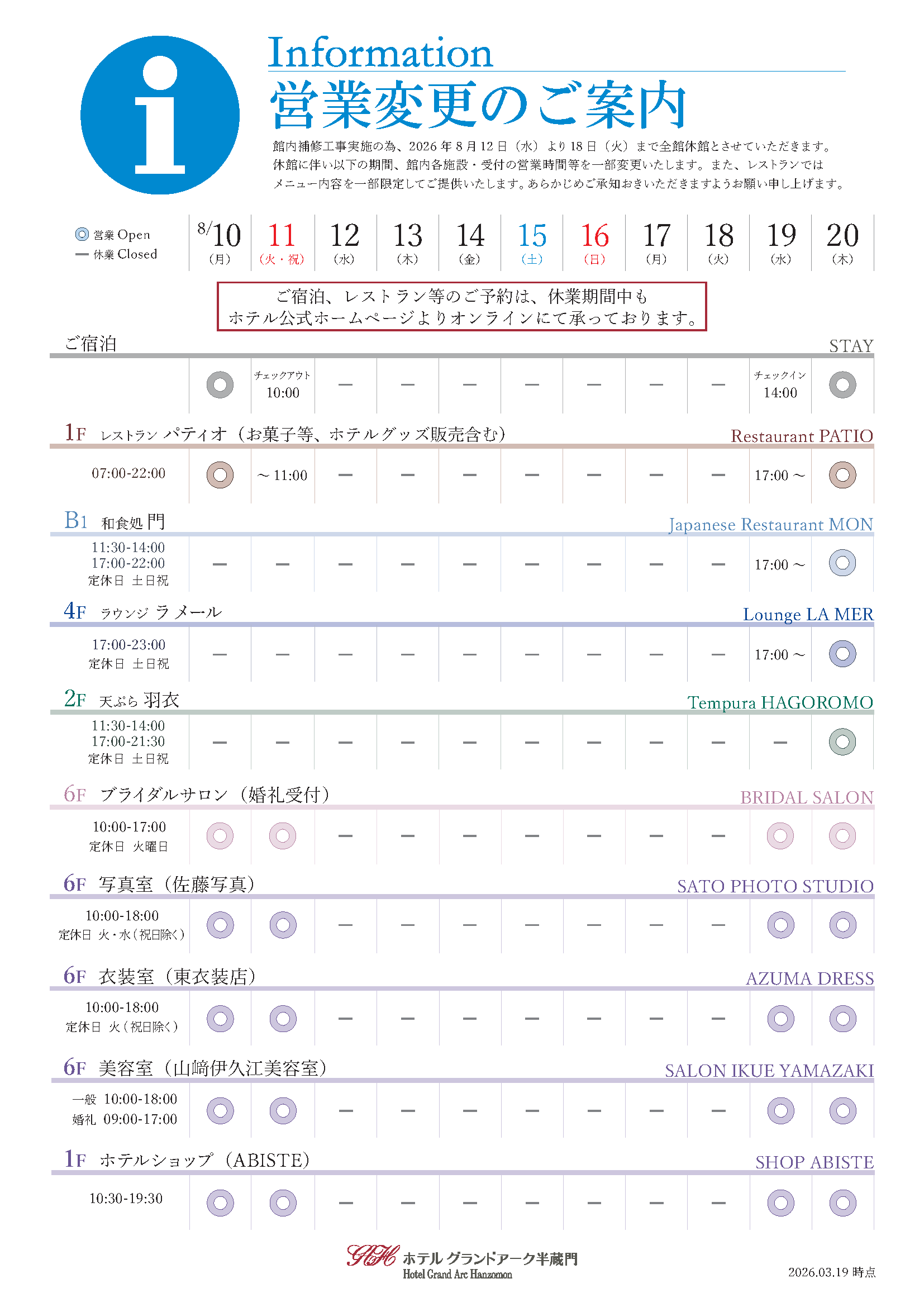 2026年8月12日(水)~8月18日(火)館内補修工事に伴う全館休館および各店舗営業時間変更のご案内
