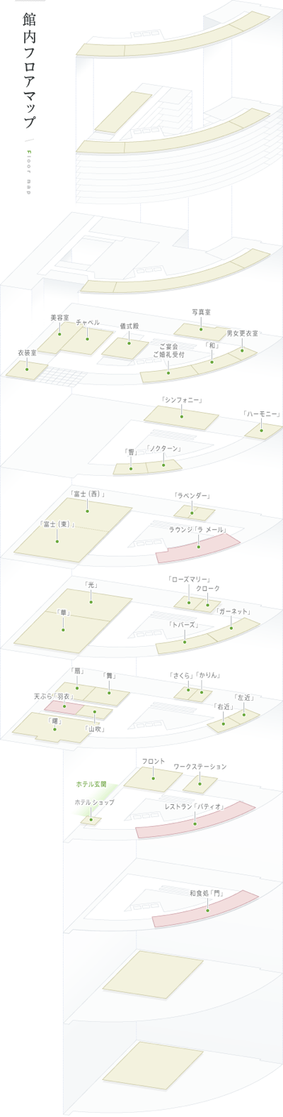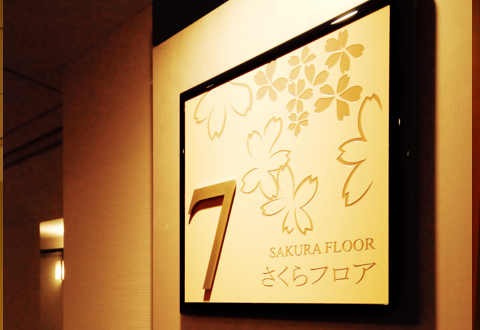 和客室専用のフロアです。エレベーターを降りると、ほのかな桜の香りが漂う素敵な演出でお客様をお出迎え。伝統的な和の落ち着いた雰囲気の中、ゆったりとしたくつろぎのひとときをお過ごしいただけます。