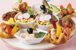 2階 色とりどりのイングリッシュガーデン風 クリームチーズとアボカドのカナッペ チリビーンズのカナッペ シーフードマリネ タンバル仕立て チキンガランティーヌ 粒マスタードと共に パティオ オリジナル パンプキンポテトサラダ