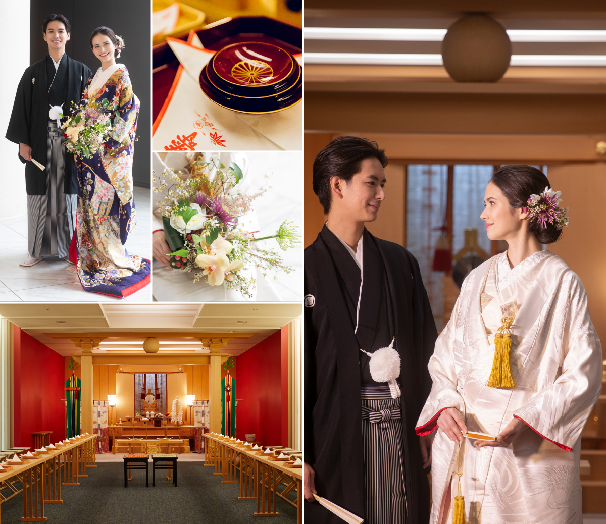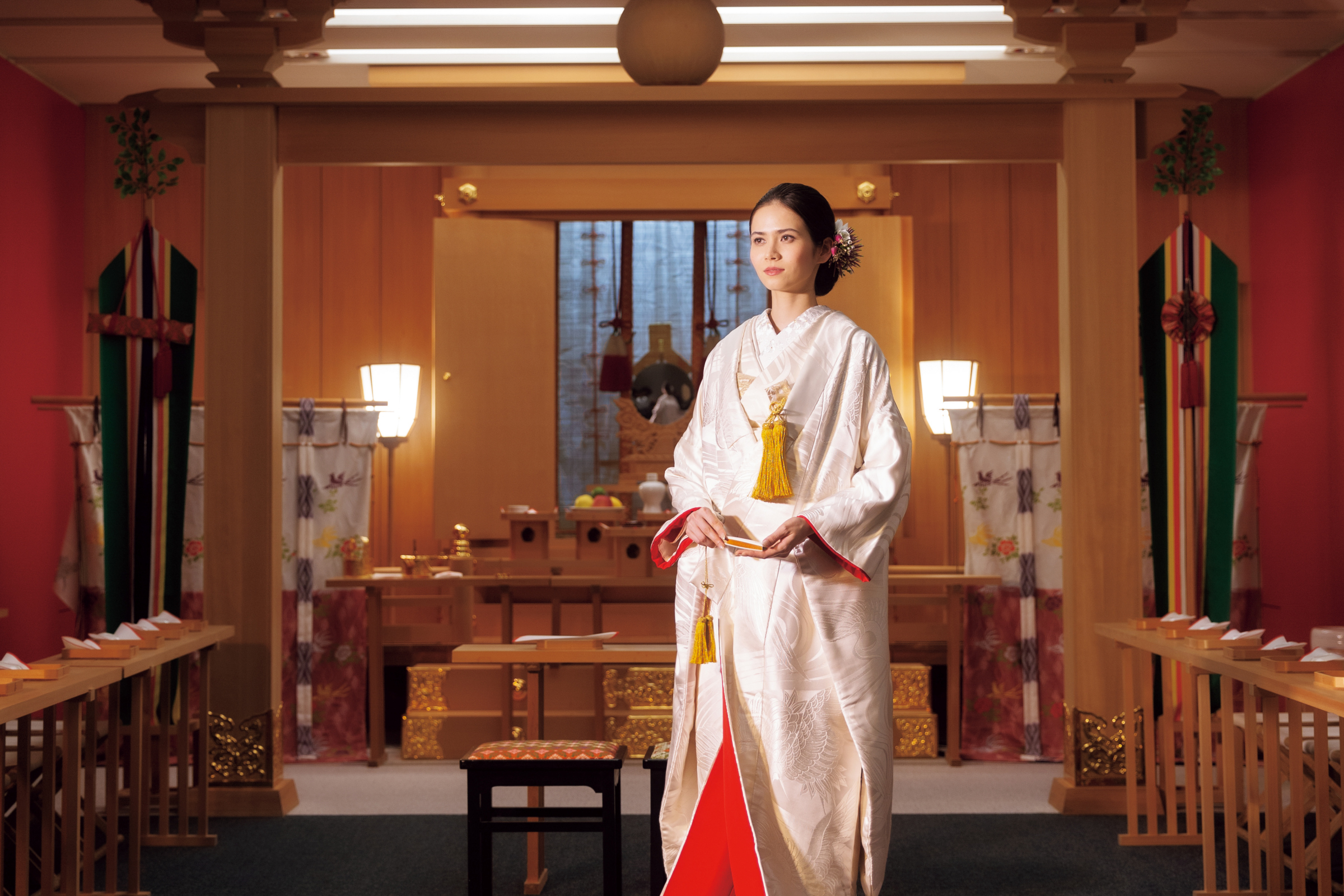 伝統的なしきたりに則って行われる古式ゆかしい和の婚礼儀式。 あたたかな光につつまれる神殿で伝統美を。