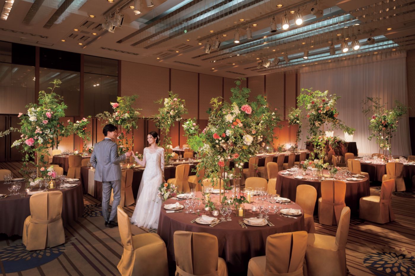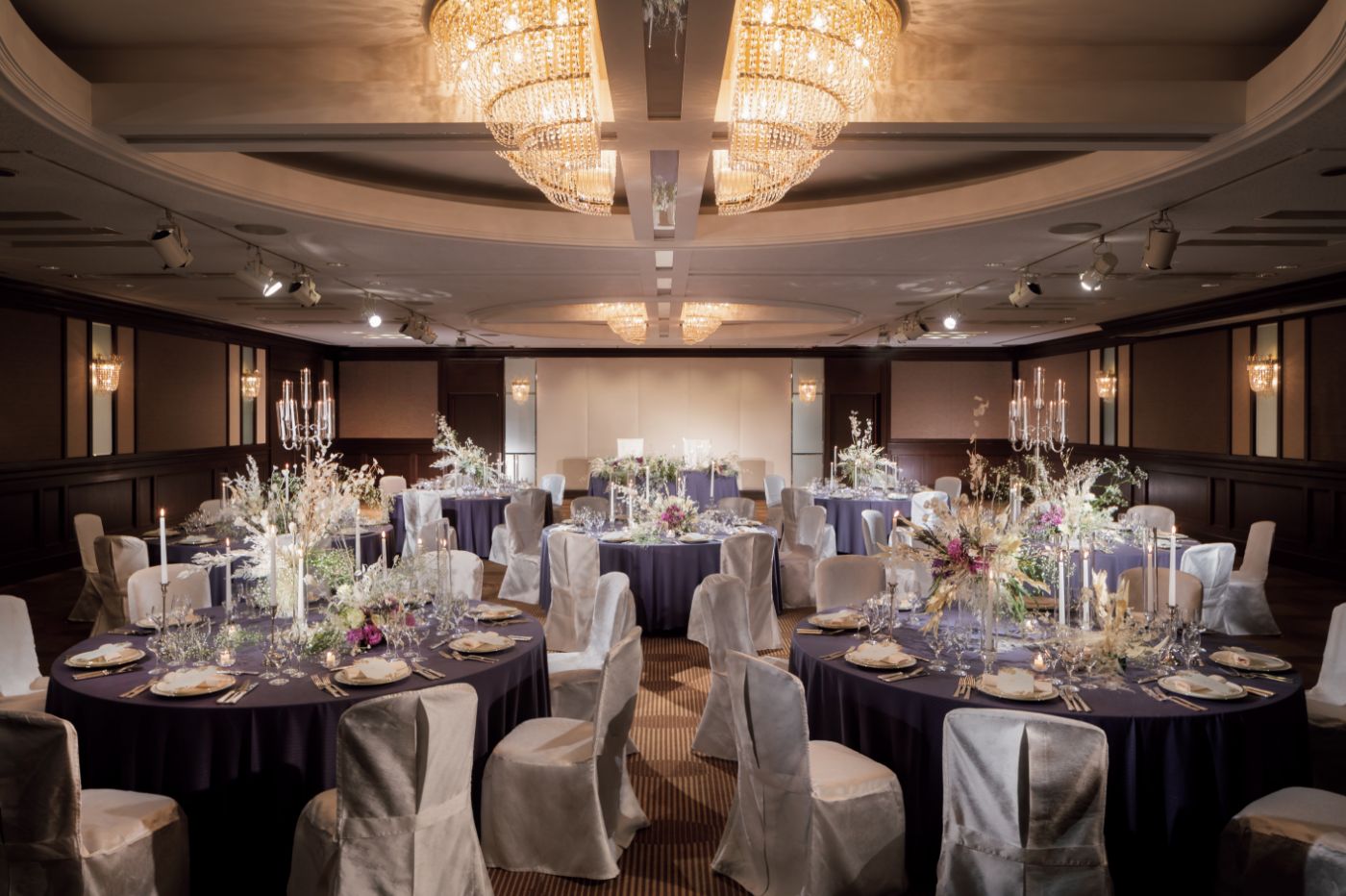 壮麗なシャンデリアが、シックなバンケットホールにエレガントな華やぎをプラス。アクセントに配した木のぬくもりと光のきらめきが調和し、おふたりとゲストをやさしく包みます。