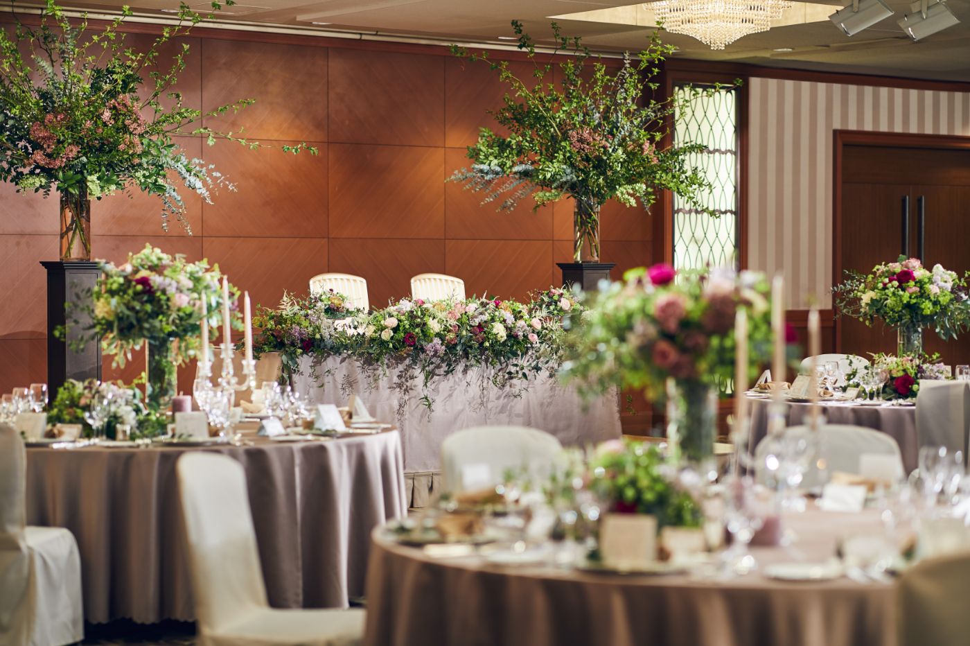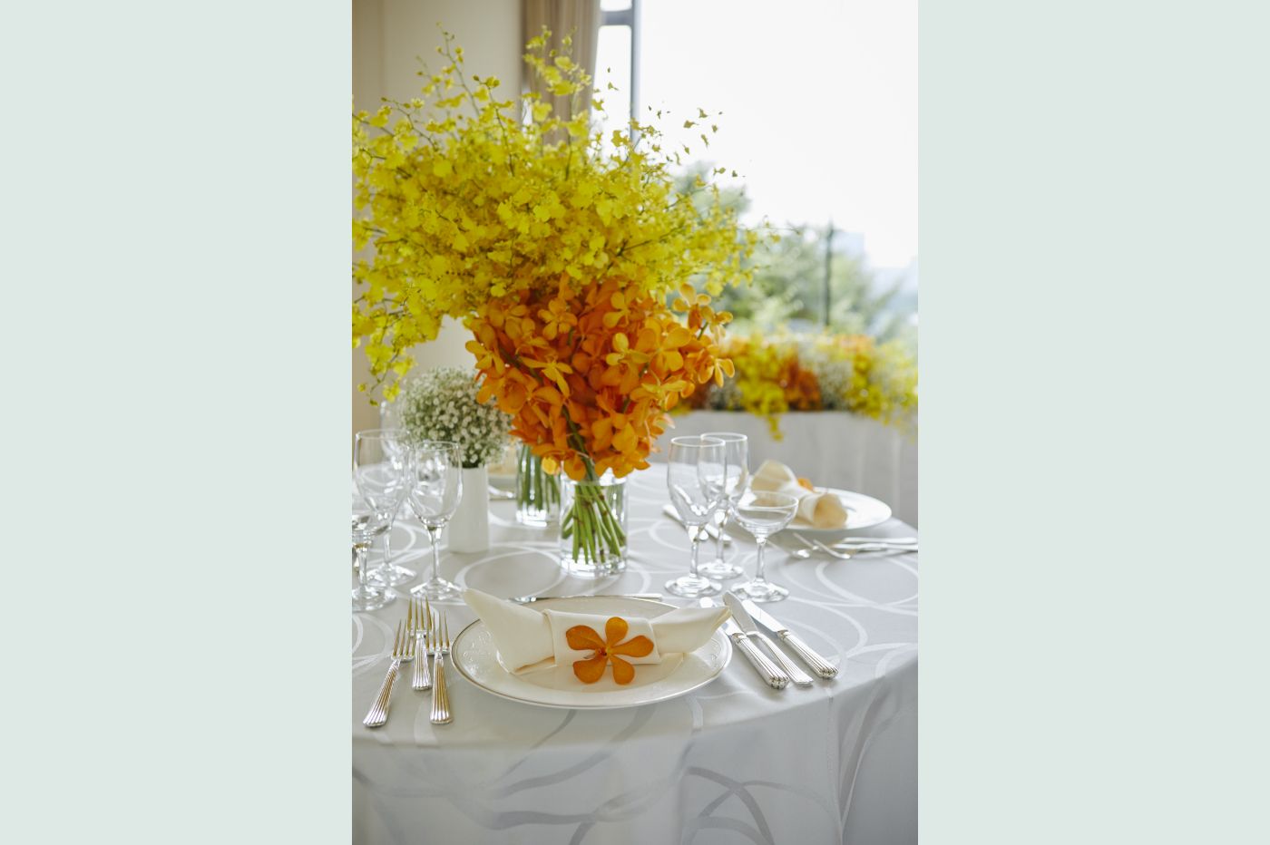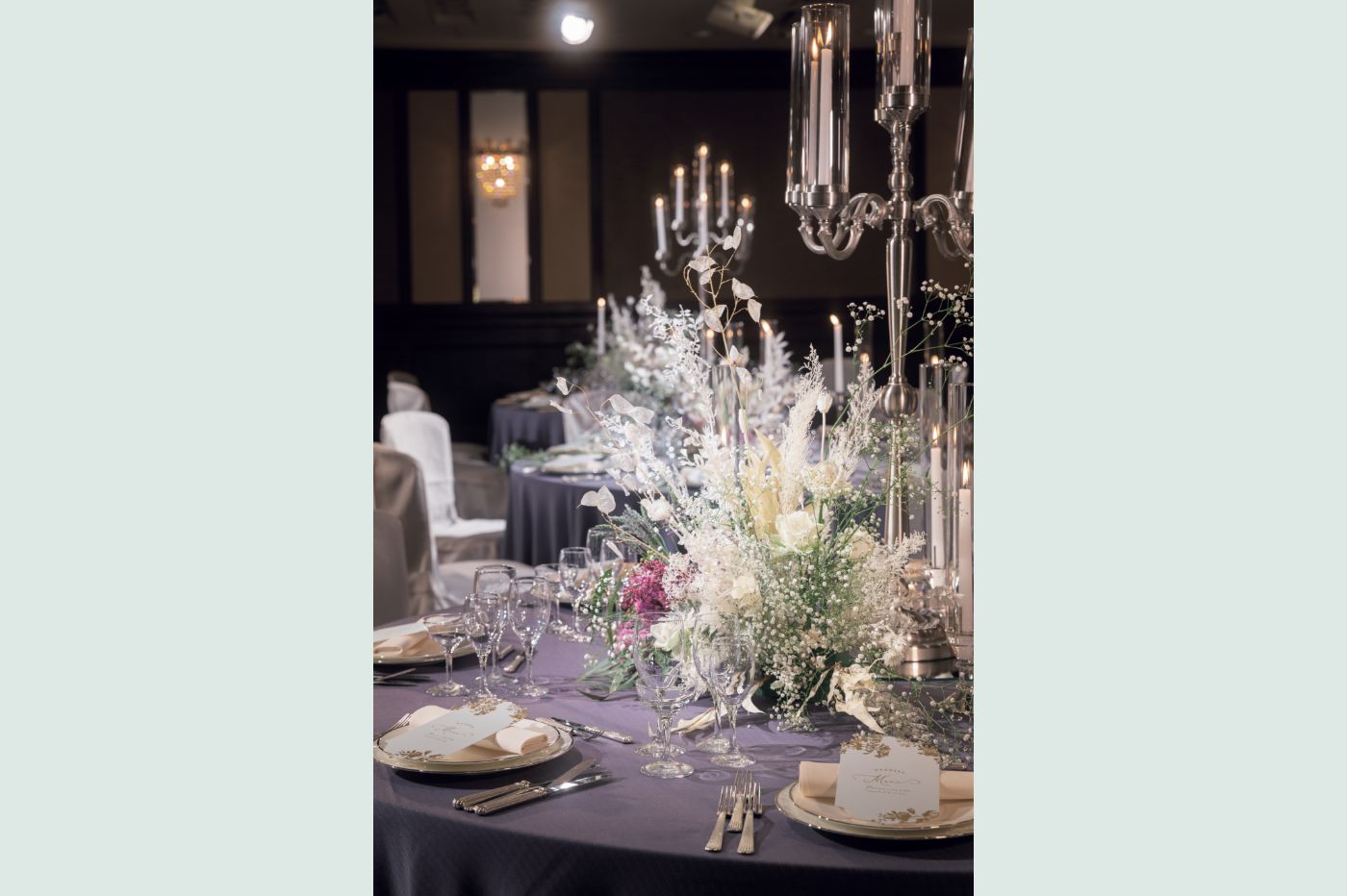 広々とした空間を生かしたダイナミックな装花はもちろん、希望のスタイルやゲストの人数に合わせてレイアウトも自由に組むことができます。